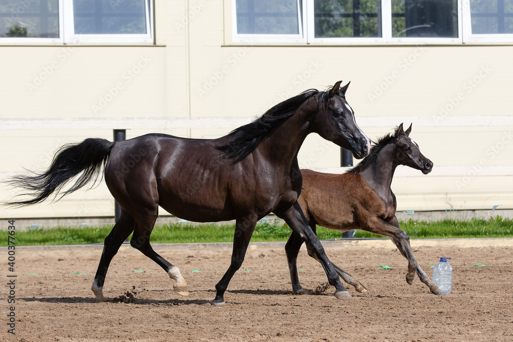 Black horse mare and young pretty arabian foal runs on sandy background, portrait in motion