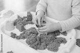 Close view of child's hands playing with kinetic sand. Children's creative game for early development and fine motor skills.