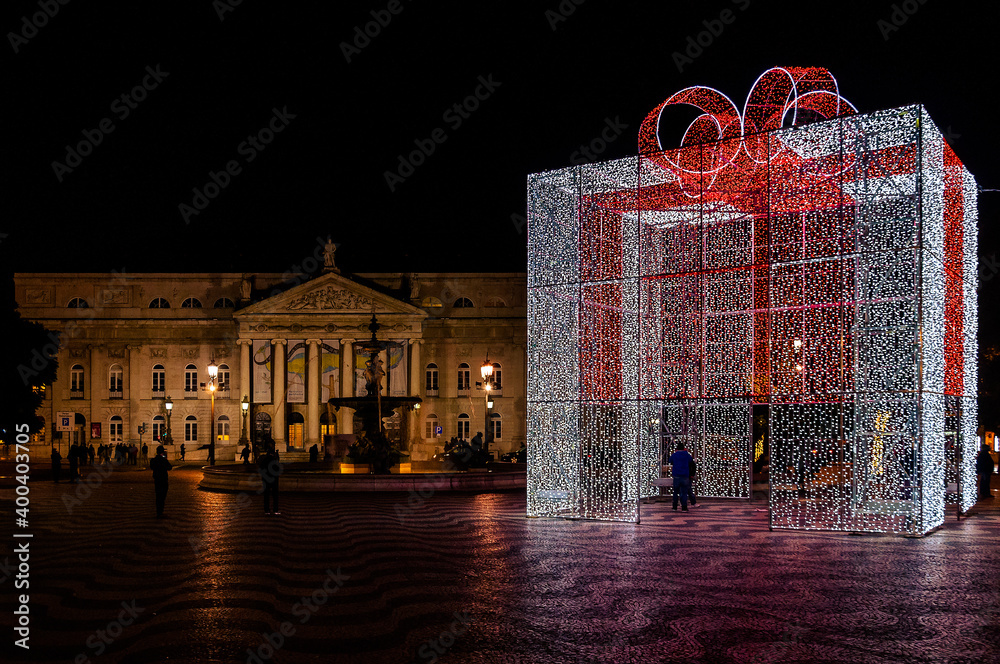 Praça do Rossio aka Praça Dom Pedro IV and Teatro Nacional D. Maria II during Christmas and holiday season at night. Lisbon, Portugal