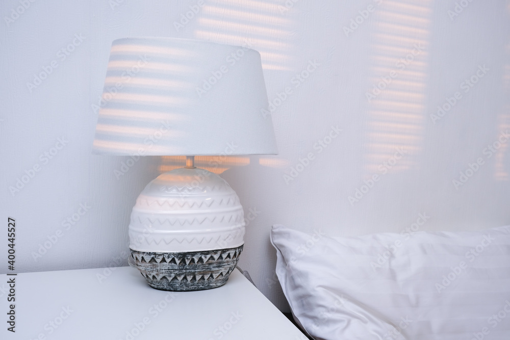 Bedroom in early morning, light white interior of apartment with sun rays on the wall, lamp on a bedside table, good morning and wake up concept