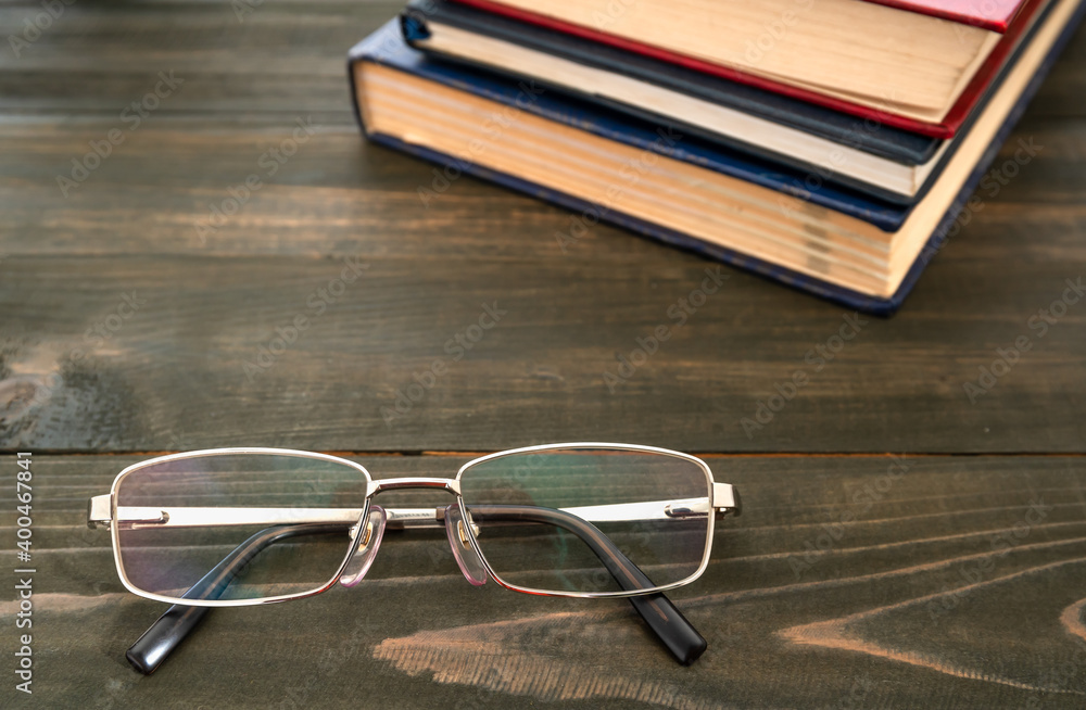 Glasses and stack of hardcover books