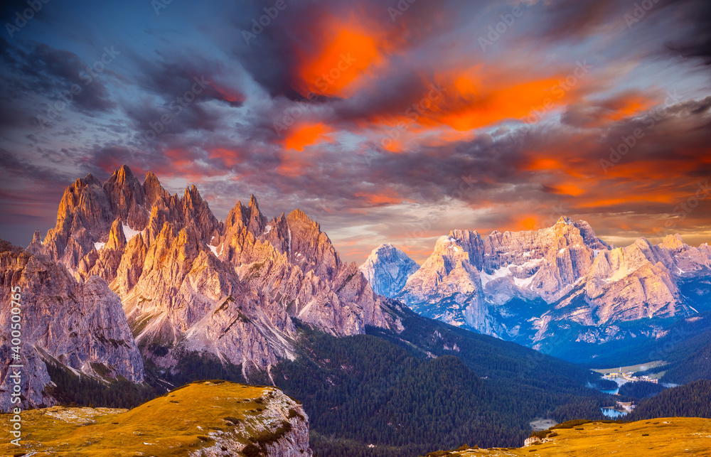 Splendid view of the Cadini di Misurina range and Sorapis group in National Park Tre Cime di Lavaredo.