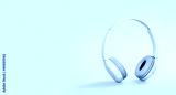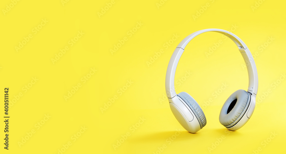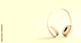 Wireless funky modern gray headphones standing upright on yellow background. illuminating. Remote learning or listening to music or radio. Copy space