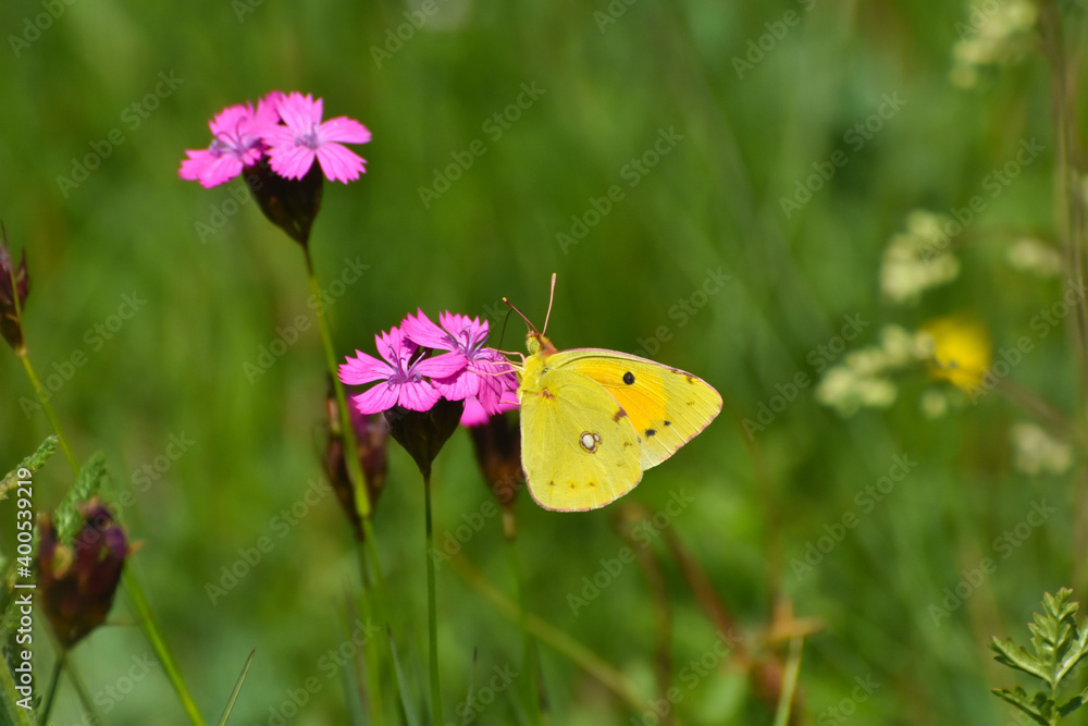 Clouded Yellow, Colias crocea, Beautiful yellow butterfly on wildflower. Yellow butterfly feeding on flowers