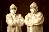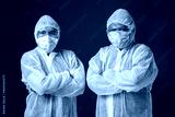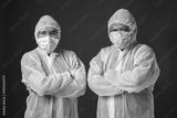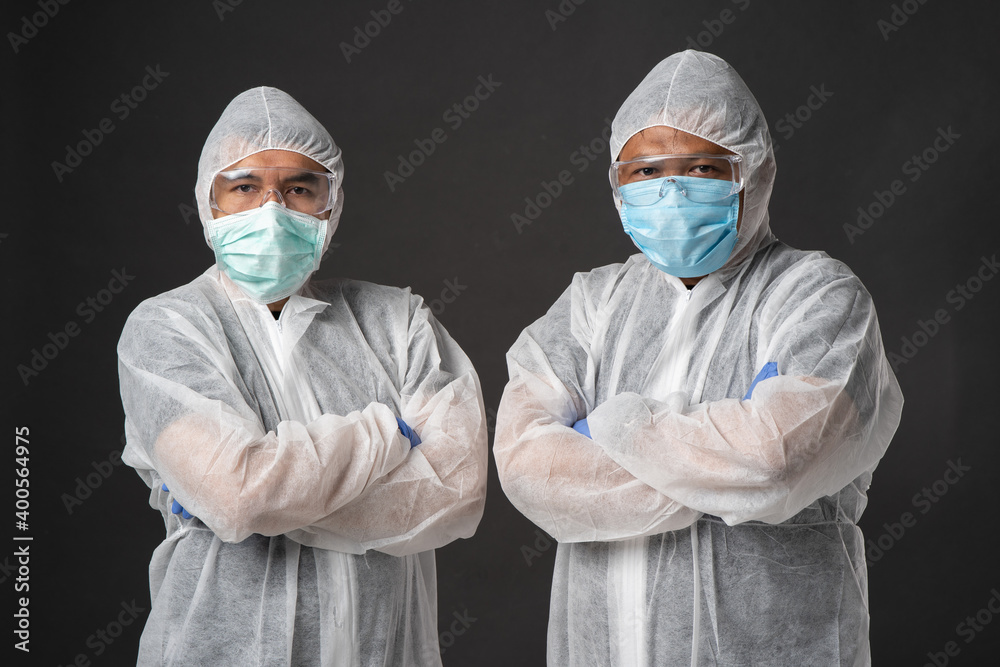 asian man with personal protective equipment suit in gray background