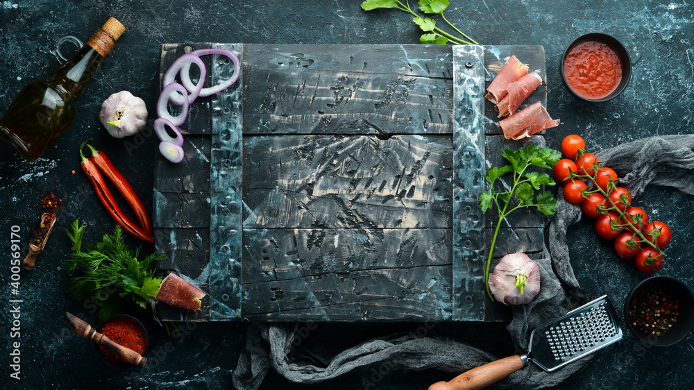Black banner. Background of cooking, spices and vegetables. Top view. Free space for your text.