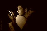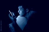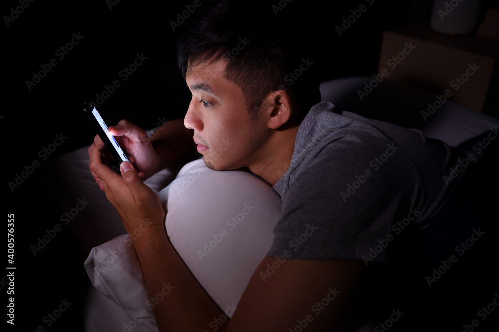 Young man having sore and tired eyes when using smartphone while lying in bed at night