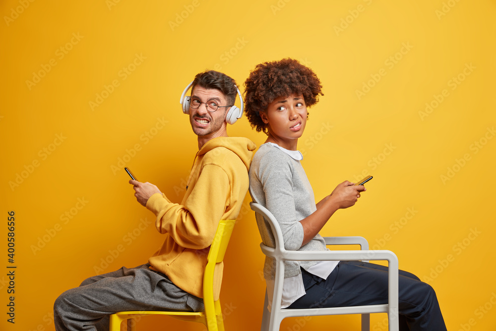 Dissatisfied millennial woman and man sit back to each other on chairs clench teeth use mobile phones check social networks news online use new app annoyed by spam isolated over yellow wall.