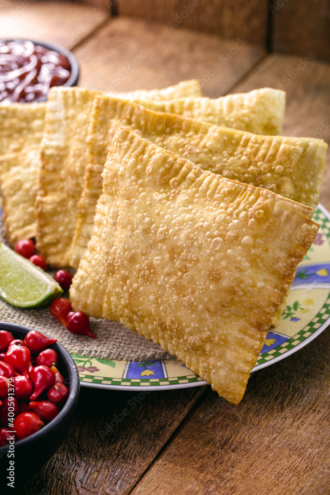 Brazilian pastry, traditional fried dough called pastel with lemon or pepper, typical Brazilian food
