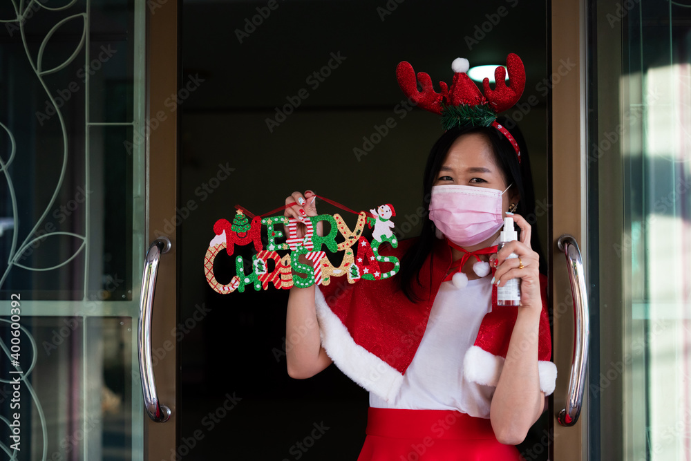 Woman in Santa Claus suit with wearing face mask and holding alcohol spray in christmas day