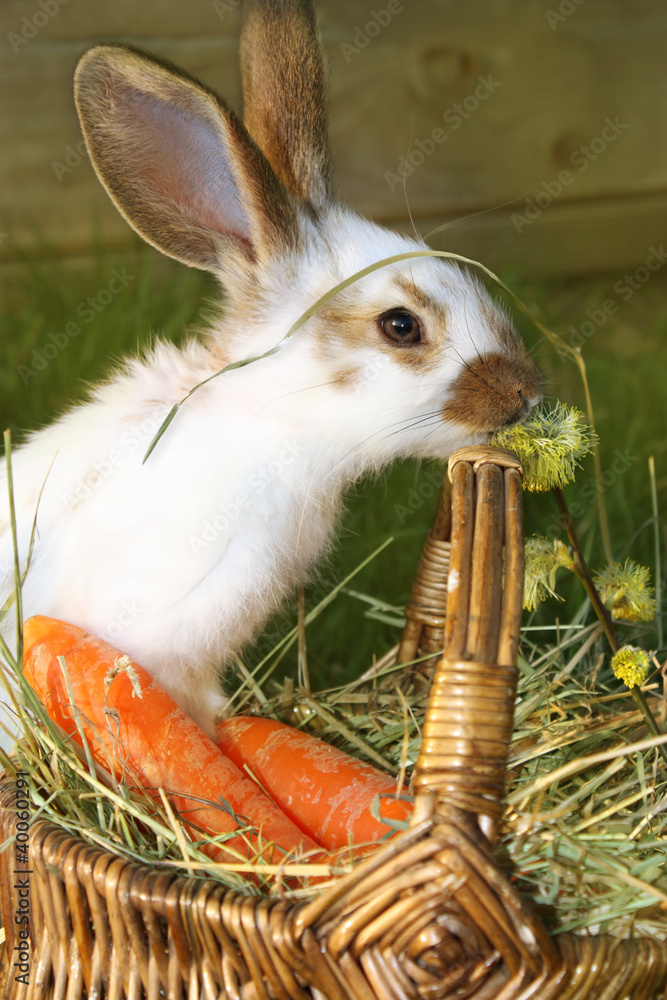 Junges Kaninchen knabbert Weidenkätzchen