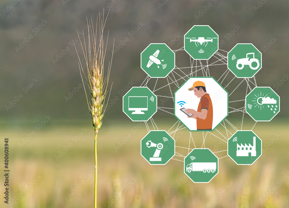 Smart Agriculture concept. Grain production with modern farming technologies. Wireless communication icons. Wheat field with background. The farmer works agricultural jobs remotely by mobile phone