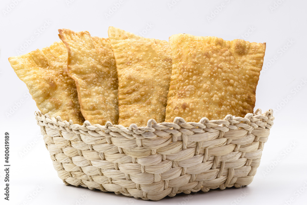 Brazilian pastry, traditional pasta called meat pastry on isolated on white background, copyspace