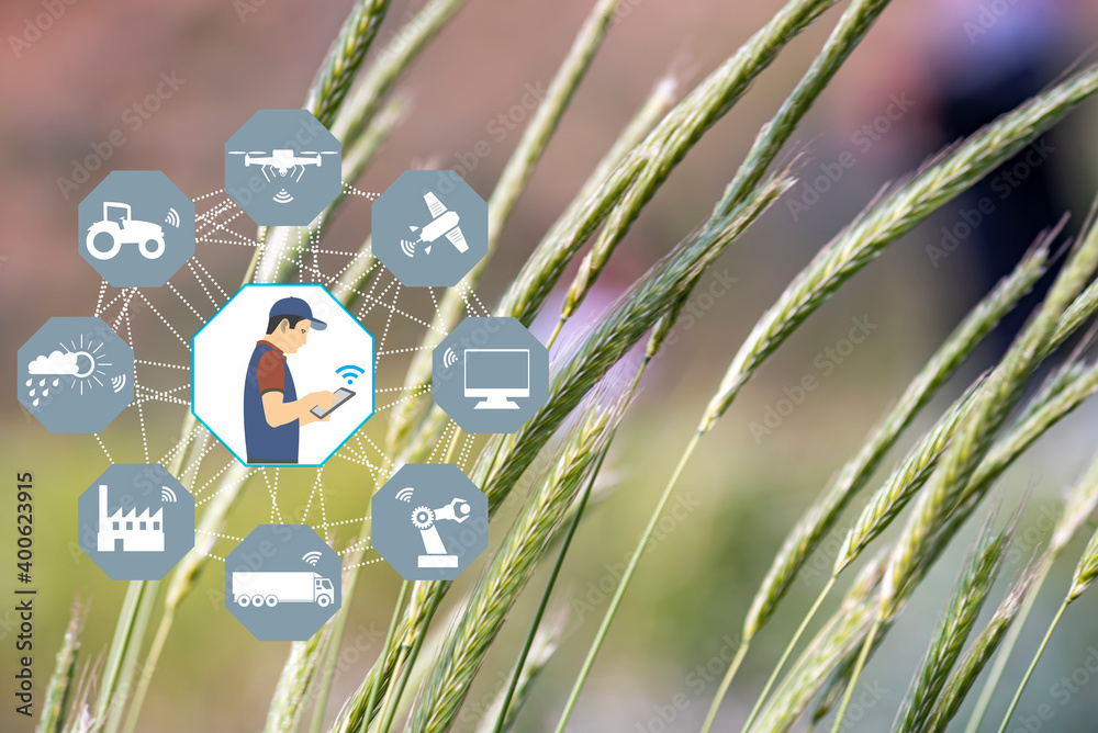 Smart Agriculture concept. Grain production with modern farming technologies. Wireless communication icons. rye field with background. The farmer works agricultural jobs remotely by mobile phone