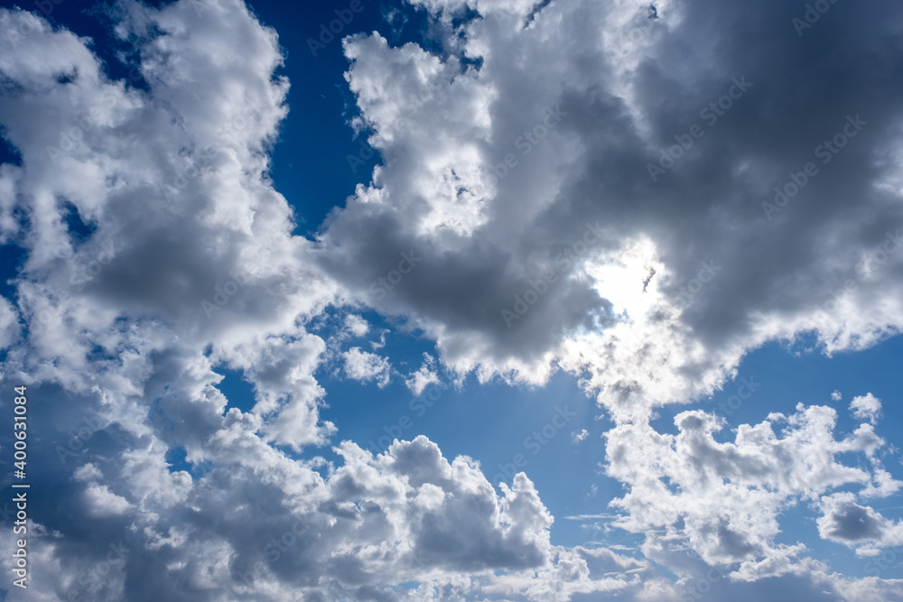 Natural sky background. Grey and white fluffy clouds hanging on the blue sky. Sun shines bright behind the clouds.