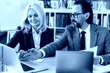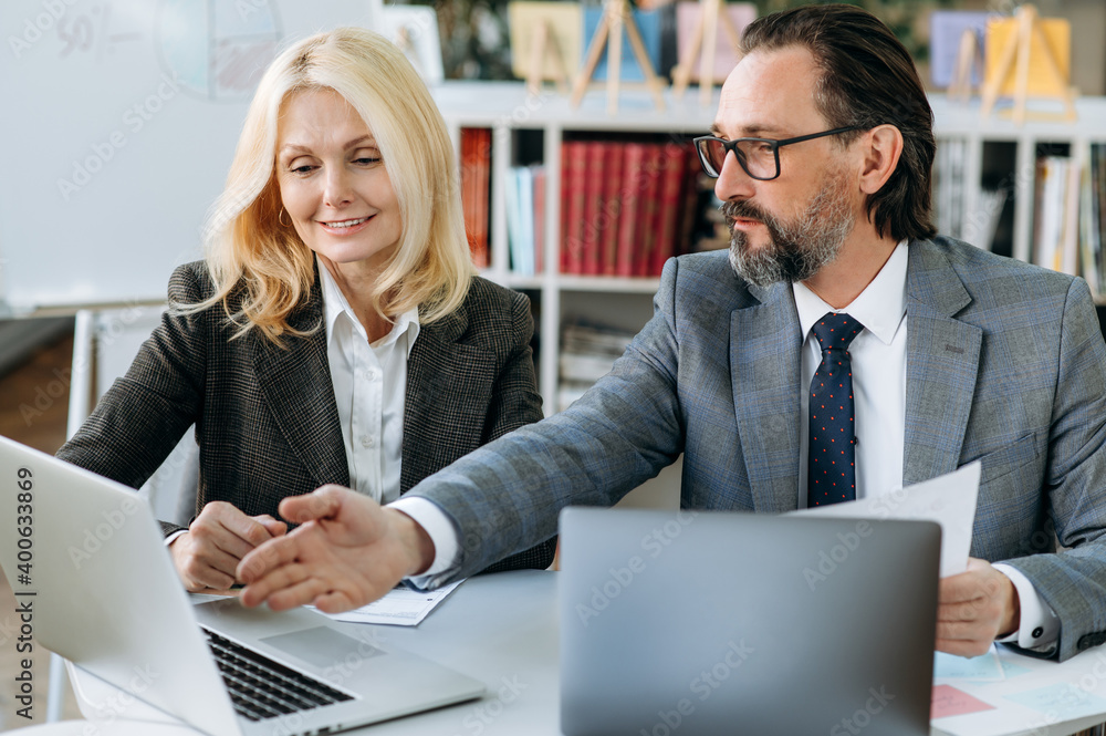 Mature business coworkers discussing about cooperation. Influential senior man consults beautiful woman on working process. Confident colleagues are sitting at the work desk in office, using laptop