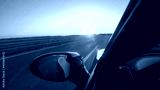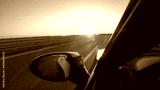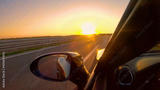 CLOSE UP Summer evening sun rays shine on a sportscar driving down empty freeway