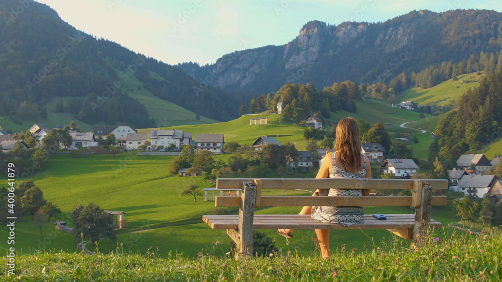 CLOSE UP: Tourist and her puppy sit on bench and look at landscape at sunset.
