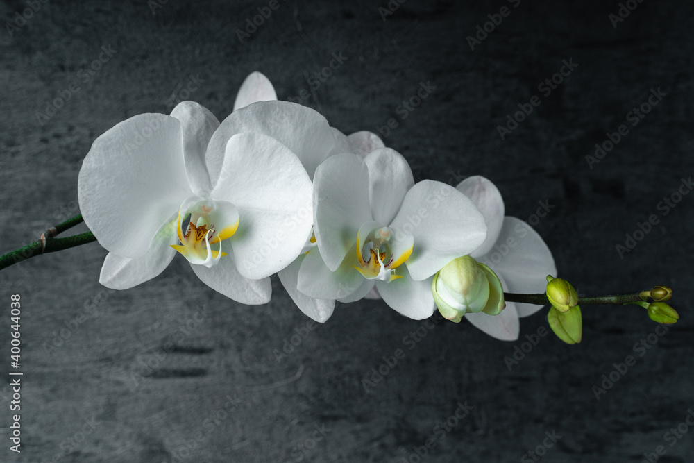 White orchid phalaenopsis close-up on gray background. Tropical flowers. Place for text. Photo for spa salon