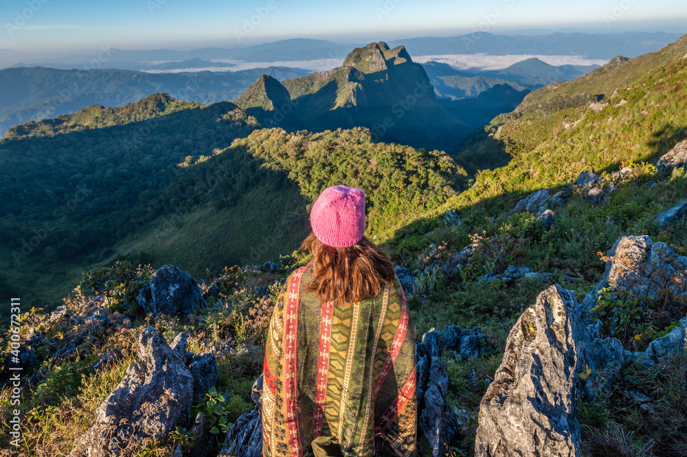 Tourist woman looking to beautiful limestone mountains view from top of Chiang Dao mountain the 3rd highest mountains of Thailand.
