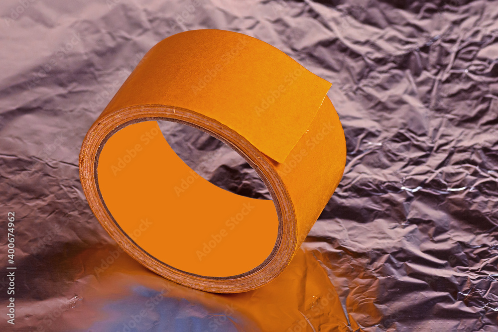 Roll of double-sided adhesive tape on a shiny surface close-up
