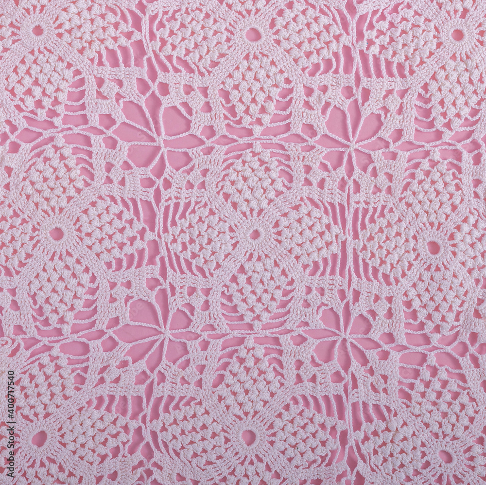 Creative pattern design made of handmade crochet on pastel pink background