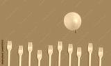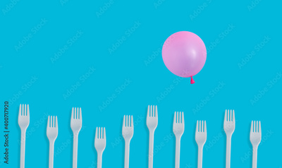 Creative business concept with pink balloon flying over kitchen forks on pastel blue background. Flat lay design