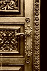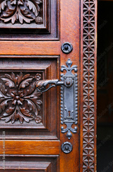 Close-up of vintage wooden hand-carved door with metal handle