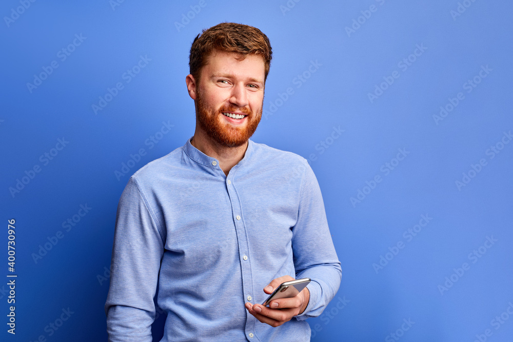optimistic male is chatting with friend on mobile phone, typing message, wearing blue formal shirt, smiling. isolated on blue background