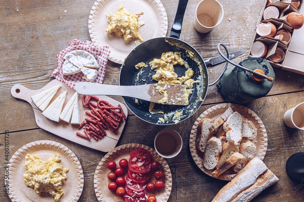 Delicious tourist breakfast on the camping. Frying scrambled eggs outdoors.