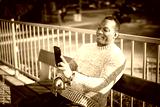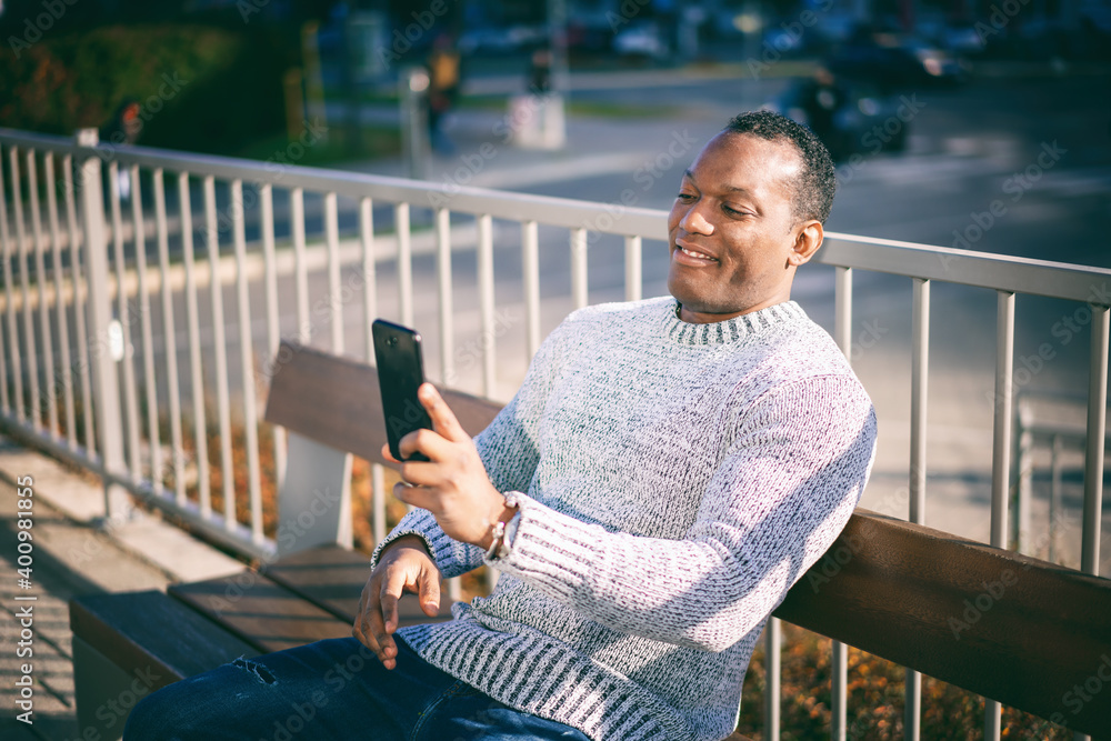 Stylish happy young african american man in a gray sweater sitting on a bench and talking in a smartphone has video communication on a city street
