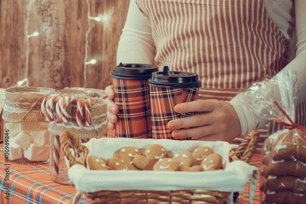 Christmas pastry shop. Woman seller, waitress selling hot chocolate in paper cup, gingerbread, marshmallows, cookies, sweets in a small cozy cafe.