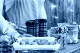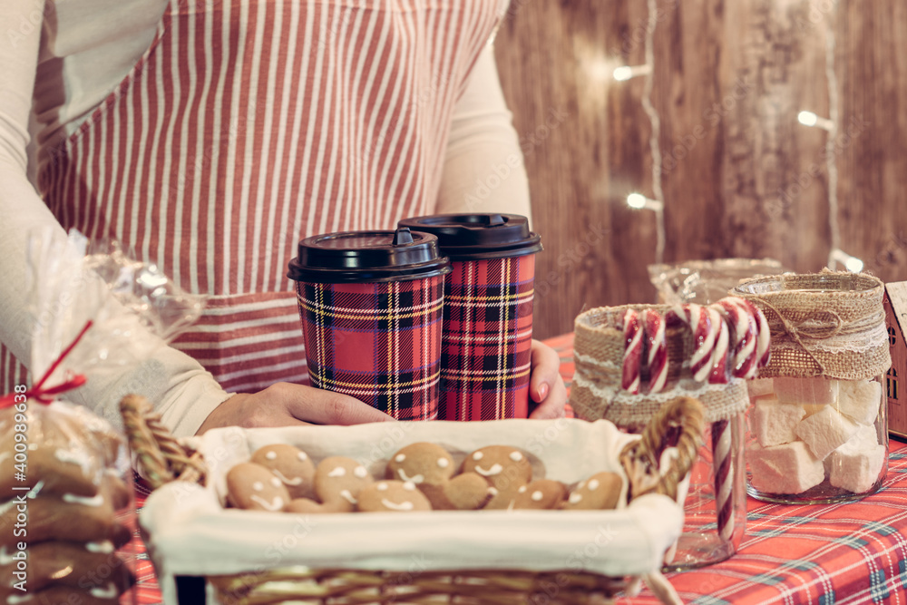 Christmas pastry shop. Woman seller, waitress selling hot chocolate in paper cup, gingerbread, marshmallows, cookies, sweets in a small cozy cafe. Cropped