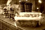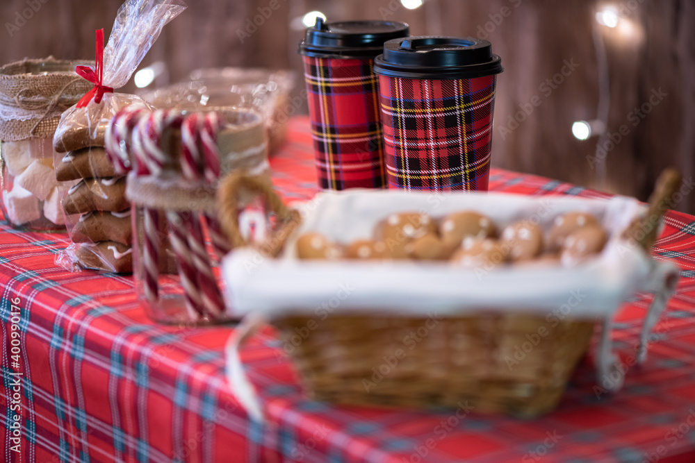 Christmas, New year pastry shop. Gingerbread, marshmallows, cookies, sweets hot chocolate and coffee on the counter in a small cozy cafe. Homemade bakery