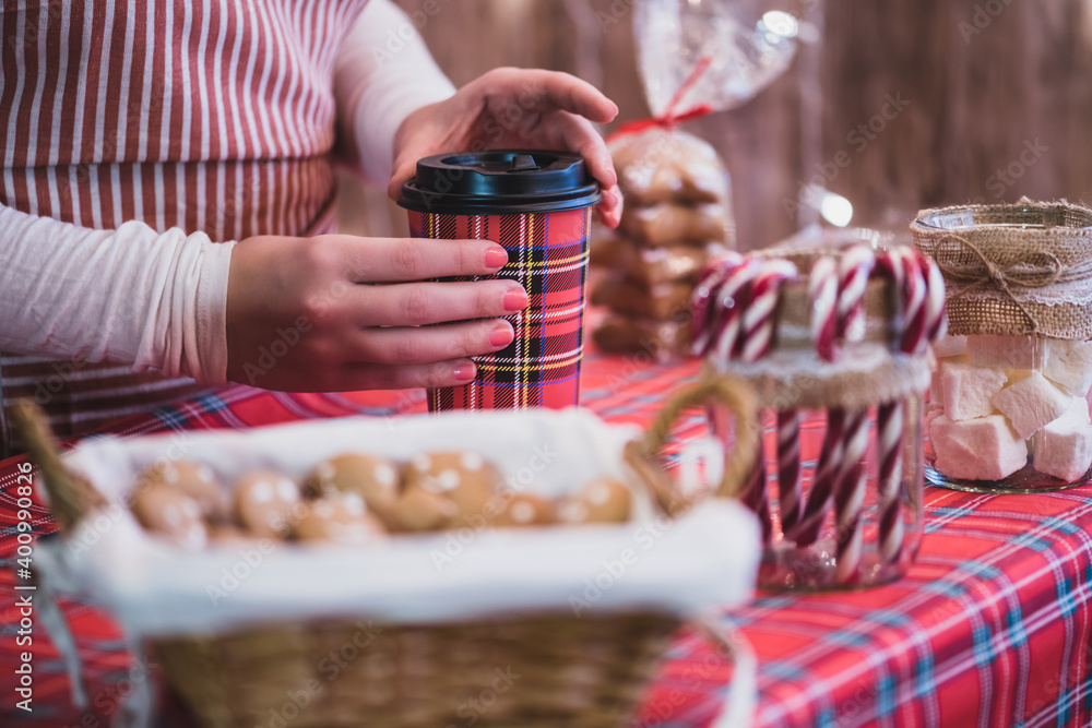 Christmas pastry shop. Woman seller, waitress selling hot chocolate in paper cup, gingerbread, marshmallows, cookies, sweets in a small cozy cafe.
