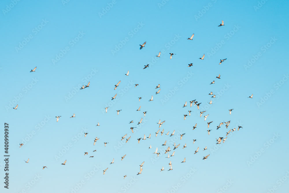 A flock of birds flying in the blue sky