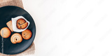 Butter cookies in a black plate on a white background.