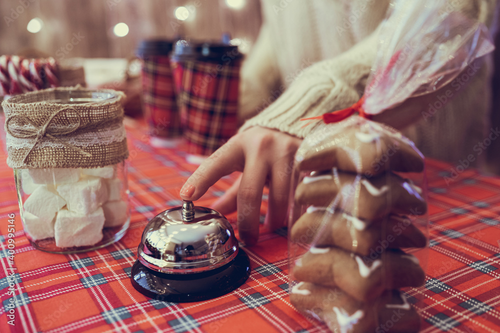 Christmas pastry shop. Woman seller, waitress ringing bell to warn that coffee in paper cup is ready. Gingerbread cookies, marshmallows in a small cozy cafe.