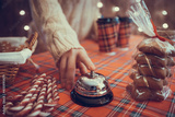 Christmas pastry shop. Woman seller, waitress ringing bell to warn that hot chocolate in paper cup is ready. Gingerbread cookies, marshmallows in a small cozy cafe.