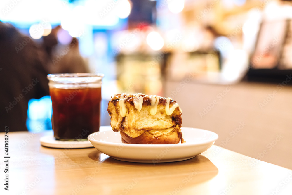 A plate of mini cinnamon rolls and a cup of black coffee