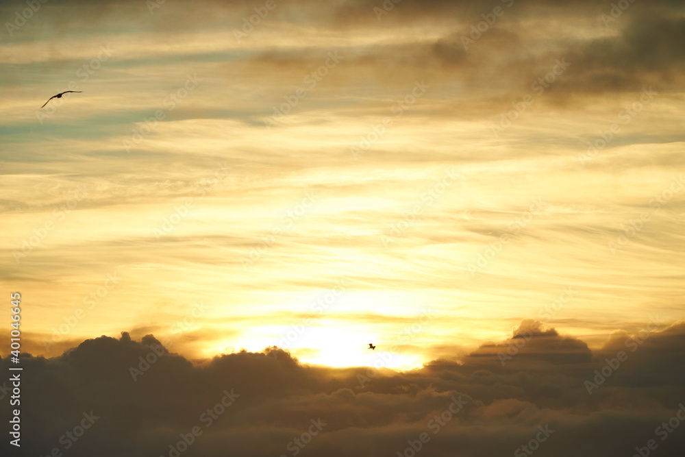 View of the sun setting over the horizon of the sea, ocean. Beautiful sunset sea with big clouds. Sea sunset background.
