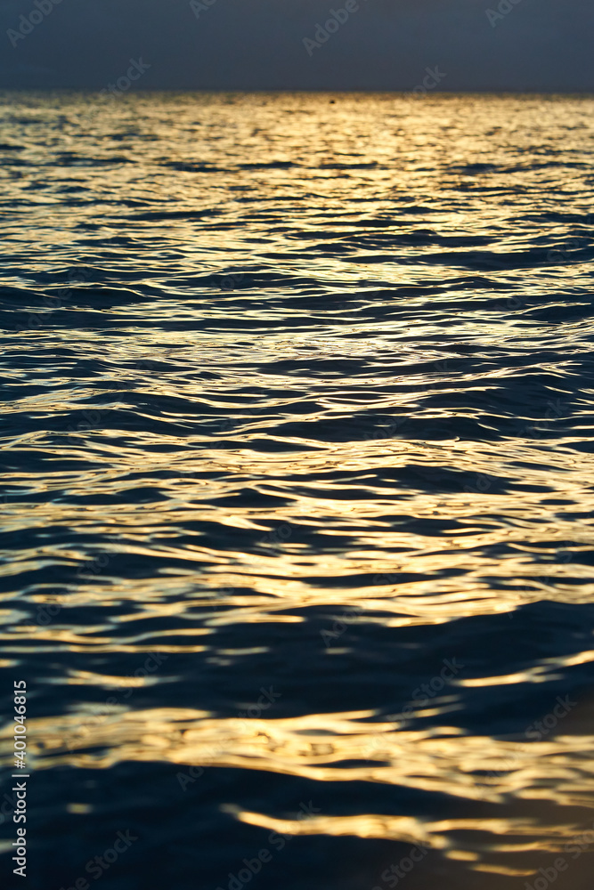 View of the sun setting over the horizon of the sea, ocean. Beautiful sunset sea with big clouds. Sea sunset background.