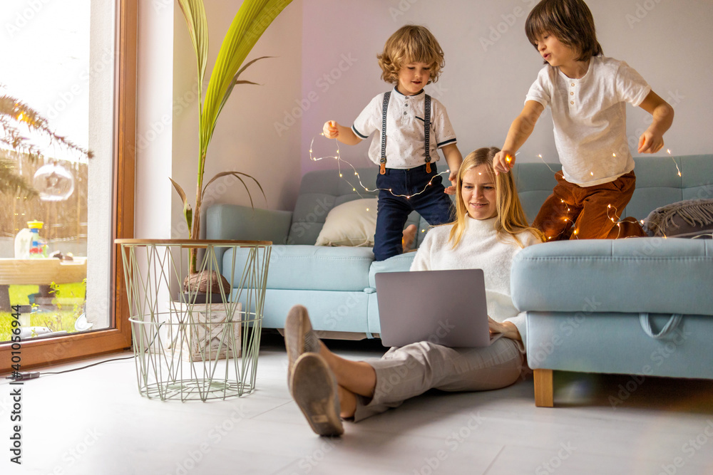 Young mother trying to work from home with her kids as a company