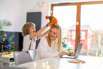 Young mother trying to work from home with her little son as a company