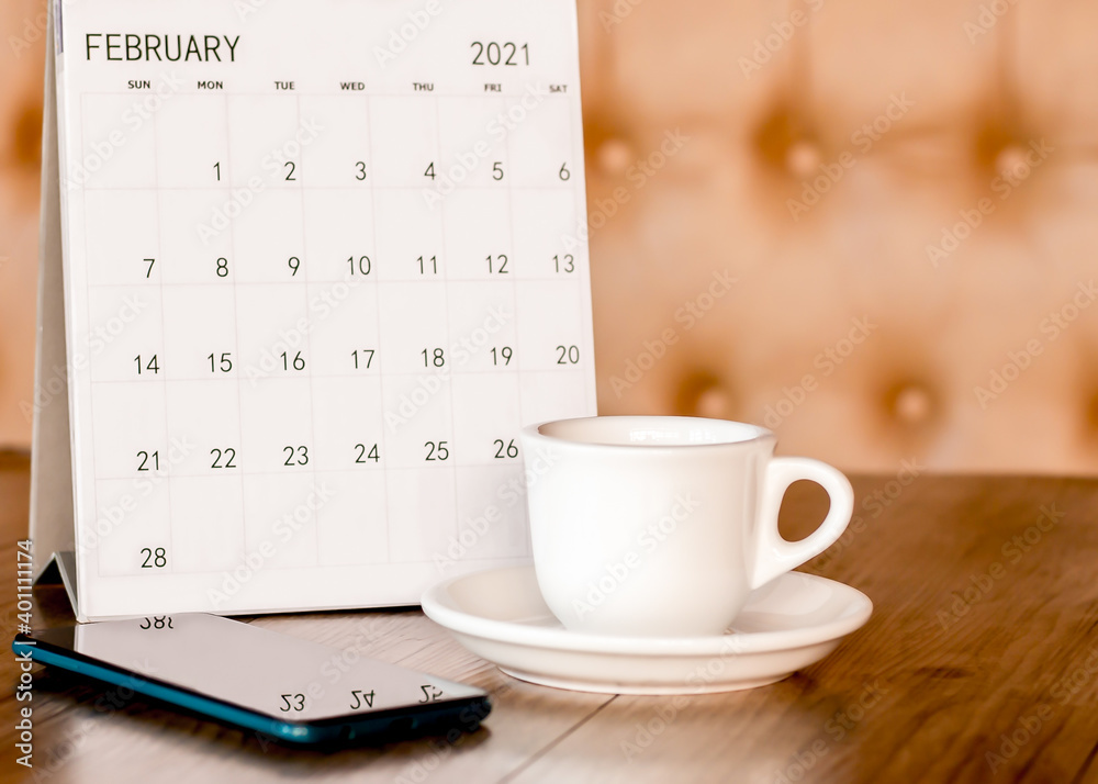 Calendar, mobile, coffee cup Placed on an old wooden table is a planning idea for success.