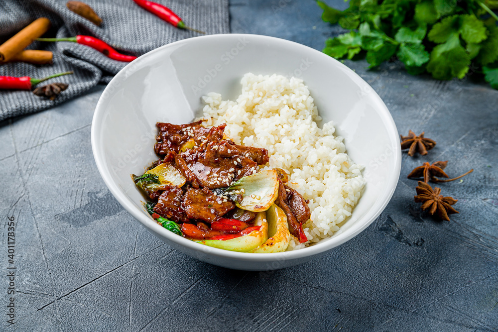 Fried pork with vegetables in Thai sauce with rice on grey stone table, chinese cuisine
