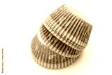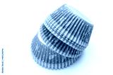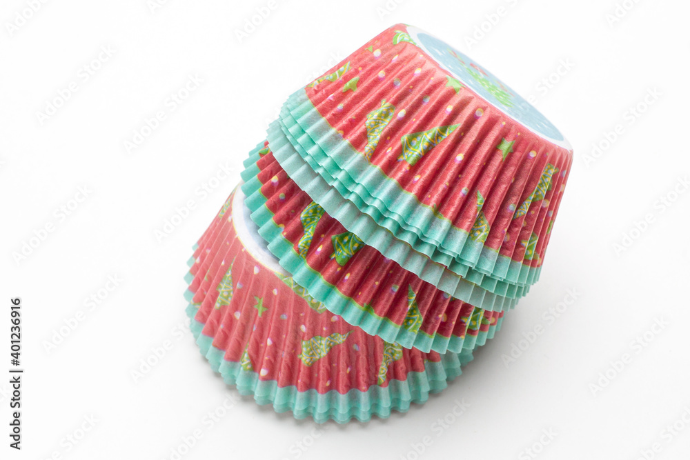 Paper muffins and muffins baking pan with christmas snow pattern on white background, object photography