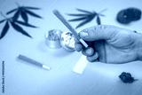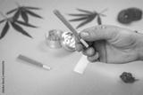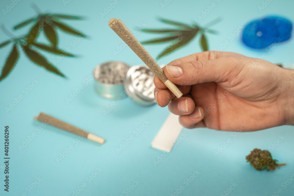 Hand with pre-rolled CBD medical marijuana and hemp leaves on blue cyan background. Organic and natural hemp-based cosmetic and beauty products. Medical cannabis concept. Still life.