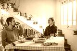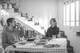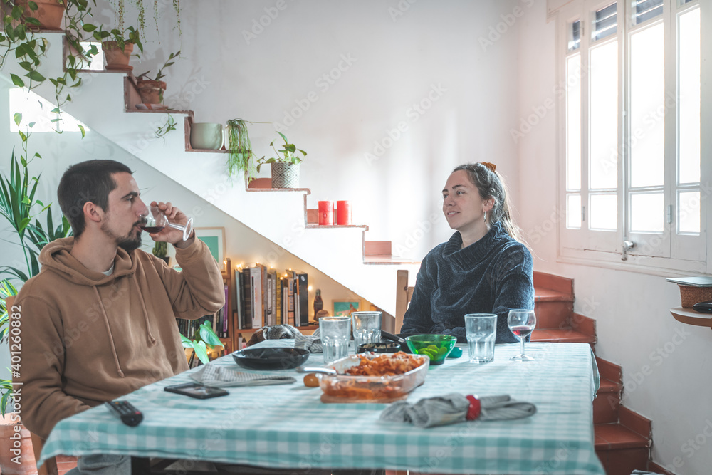 Friends having fun during dinner at dining table. Cheerful young people eating, toasting and enjoying with friends at home.
