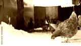 Chicken on the background of winter. Chicken on the farm in winter. Domestic chicken walking and eating on the snow farm in the winter